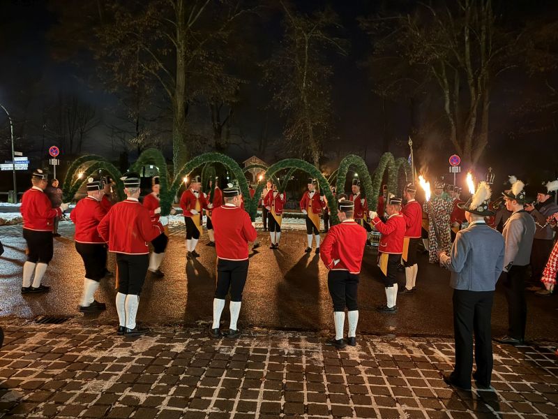 Auf dem (fast) freien Parkplatz vor dem Trachtenheim tanzten die Schäffler trotz größerer Besetzungsprobleme wegen der kursierenden Grippe- und Coronaviren und bekamen viel Beifall.