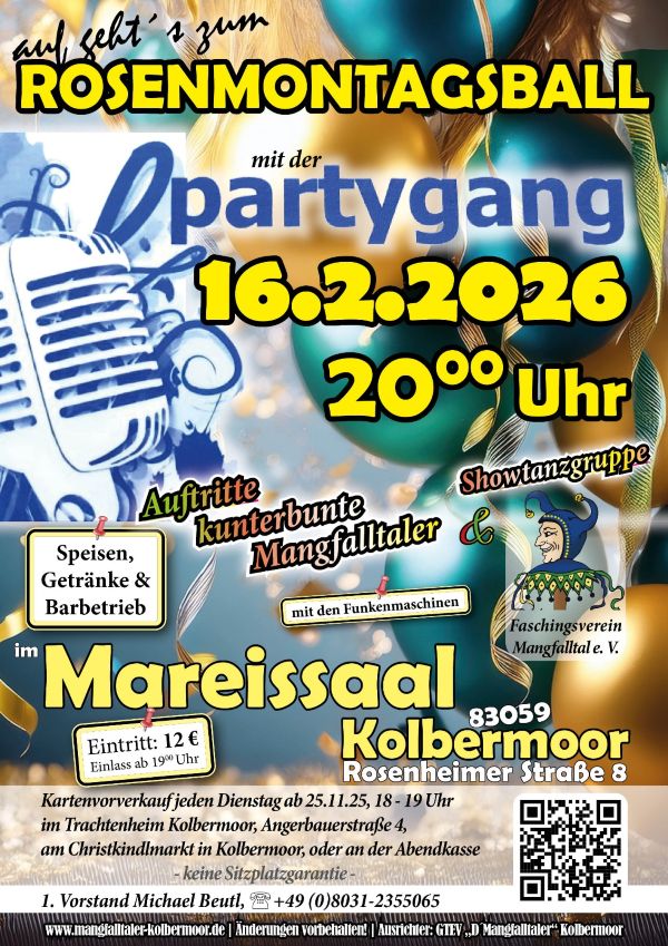 - Mo. 16.02.26 20:00 Uhr Rosenmontagsball Mangfalltaler Mareissaal Kolbermoor